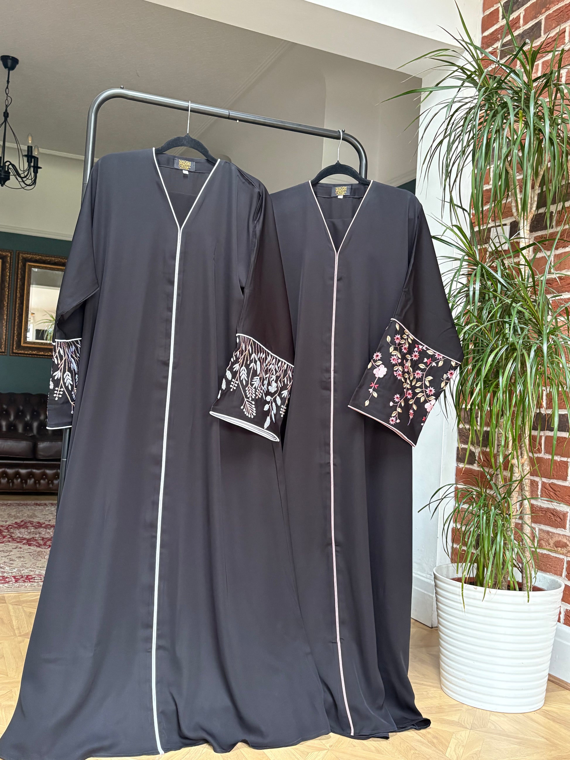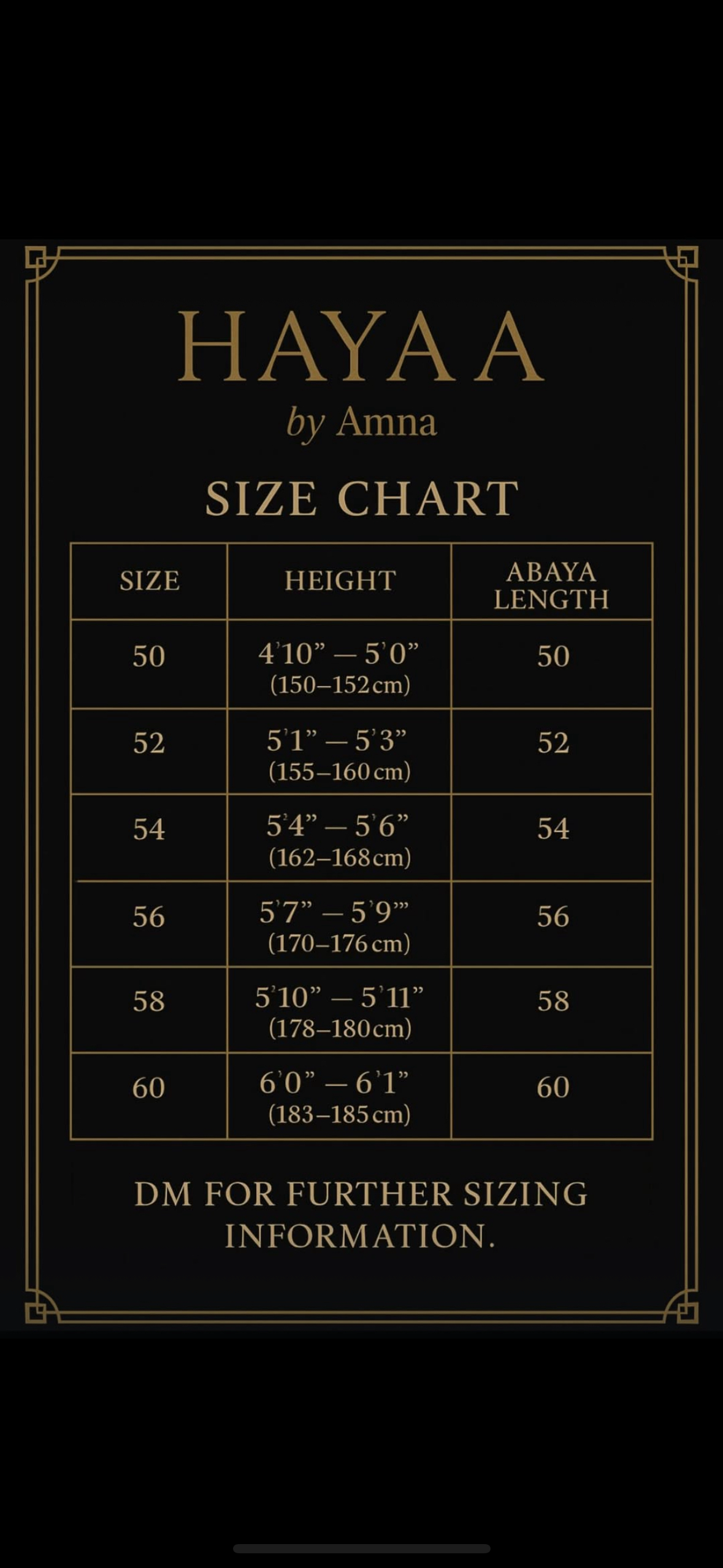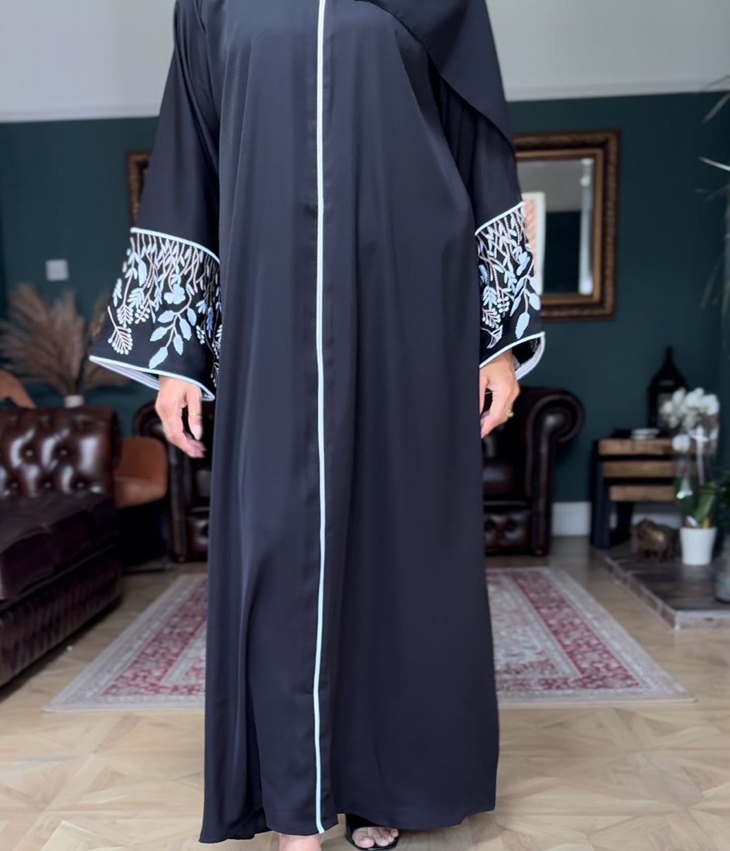 This elegant 2-piece closed abaya set is true to size, model is 5.5” and wearing size 56, the Aisha Abaya set is crafted from premium Nida fabric, offering a luxurious, buttery-soft feel and lightweight comfort. The abaya features delicate floral embroidery on the flared sleeves, beautifully accented with soft white piping along the front for a refined touch.