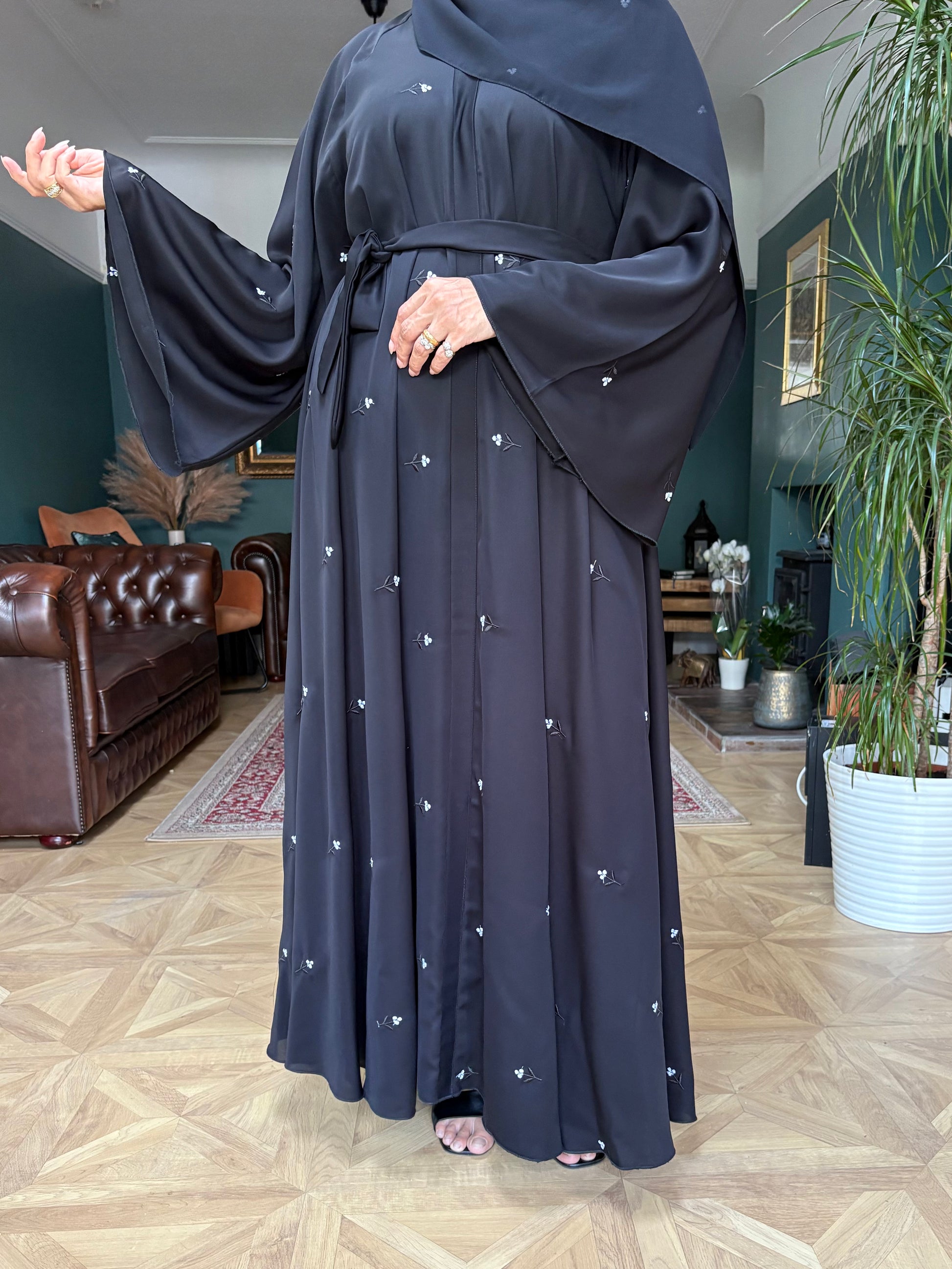 This stunning 3-piece closed abaya is designed in an elegant umbrella style, crafted from premium embroidered fabric. Featuring graceful flared sleeves, it comes with a matching hijab and belt, allowing you to style it with ease. The versatile silhouette suits all body types and can be beautifully cinched at the waist for a flattering fit.